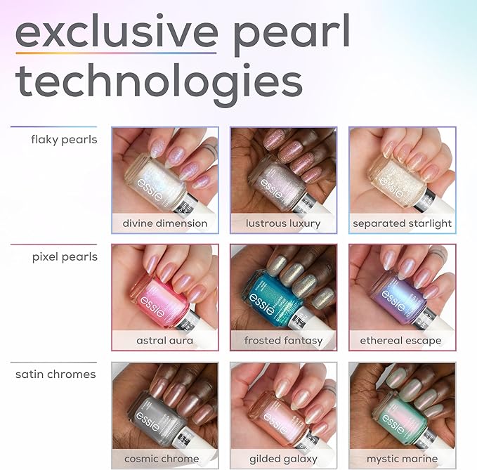 This is probably the collection that I’m personally the most excited about. The Essie Nail art studio special effect polishes are going to be a nine-piece collection consisting of special effect toppers. They are designed to bring any manicure to a new level, but they can also be applied over the naked nail. According to Essie, this collection is divided into three different ‘pearl technologies’, we’ve got the flaky pearls, pixel pearls, and the satin chromes.