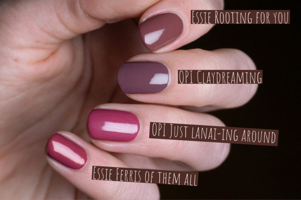 As usual, I have a ton of comparisons for Claydreaming, but, spoiler alert, I actually didn’t find a good dupe. When I was wearing Claydreaming, it reminded me a lot of Essie’s Rooting for you. However, Rooting for you doesn’t contain any purple and is very clearly just a brown/red. It’s still a very pretty shade. The other two shades that popped up in my mind were OPI Just lanai-ing around and Essie Ferris of them all. However, both of them are very clearly too pink to be dupes for Claydreaming.
